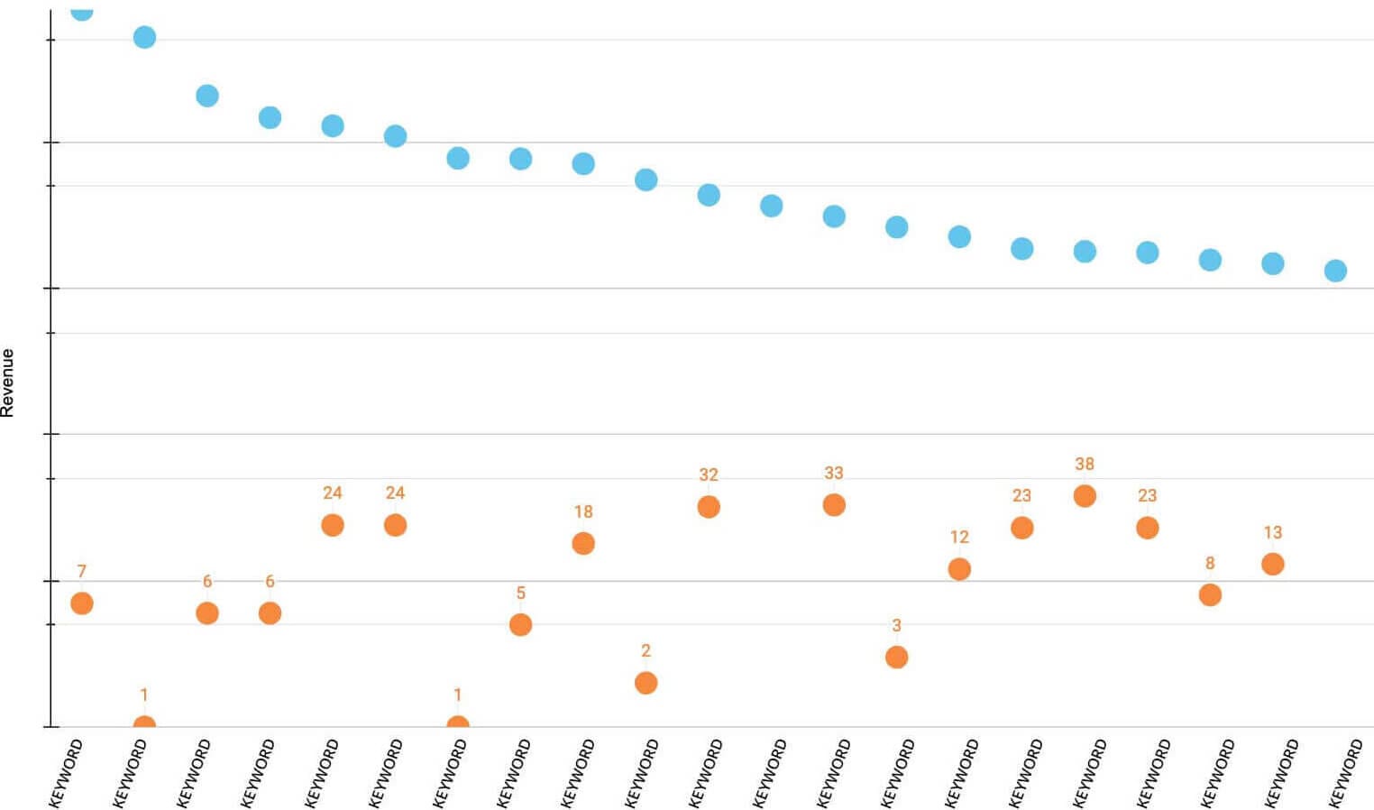 Example visualization to illustrate where Client A organically ranks (orange) for their highest-grossing Google Ads keywords (blue):